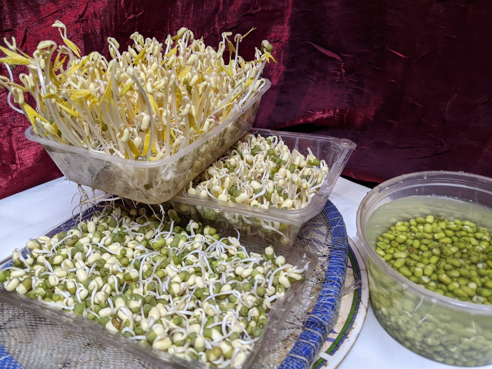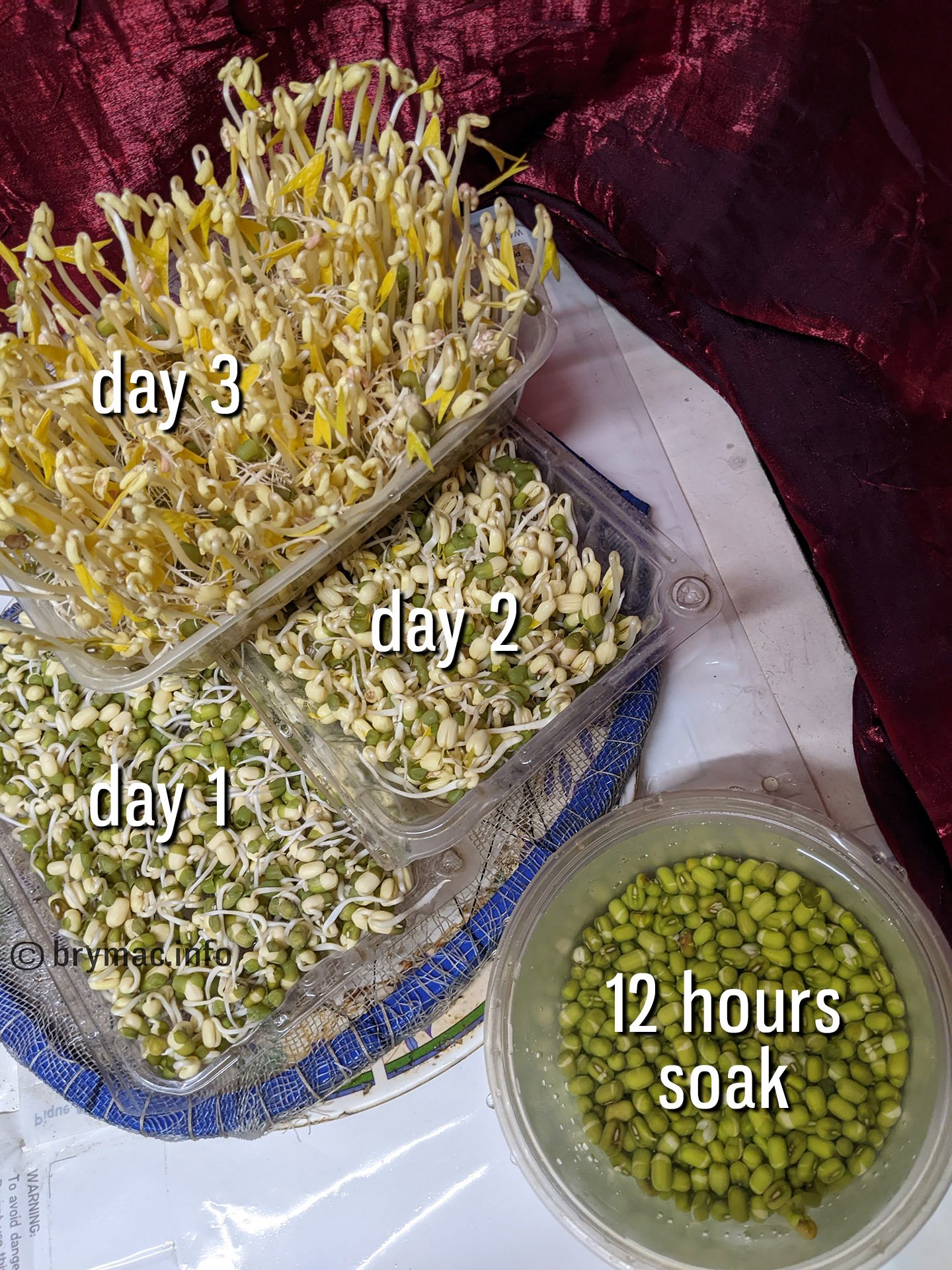 As recommended by other netizens, I chose Munggo Labo (unpolished). Price ranges from 90-120 php per kilogram. Munggo Kinis (polished) are cheaper, but probably doesn’t germinate as well or as quickly. After soaking for around 12 hours, it’ll take 3-4 days until it’s ready to harvest/cook. Having 3 trays (with drain holes) and one soaking container, a daily rotation can be achieved. Watering can be done twice, after harvesting and before going to sleep. I’ve found 30 grams of beans produces around 165 grams of sprouts. I include the husks/shells when cooking, they probably have lots/most of the fiber/nutrients.